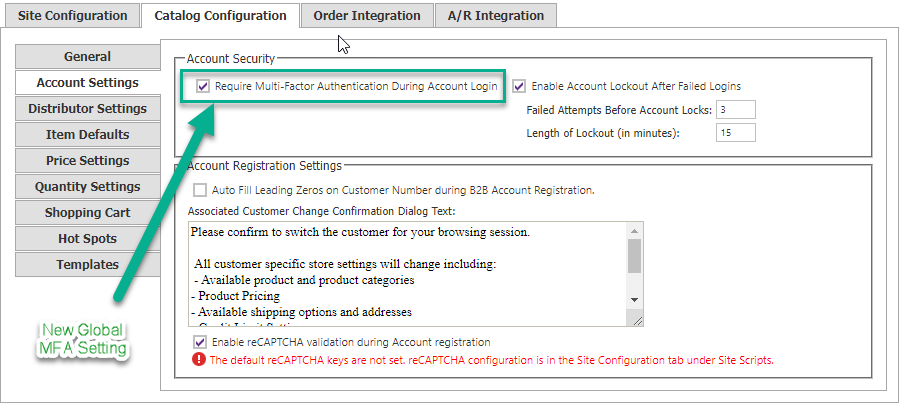 To enable mulit-factor authentication, visit the Account Settings tab of the Site ManagerCatalog Configuration screen.