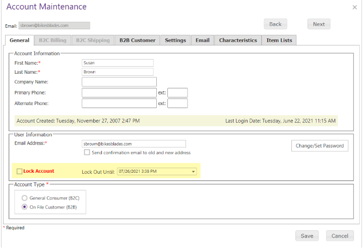If a specific account needs to be locked, for example if an account is suspected to be compromised, going to Customers >Account Maintenance>Edit you can directly lock a specific account, as highlighted below.