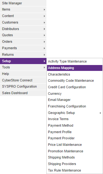 | Website Field | The following five fields should ideally be mapped in whole, or partially to the five address lines available in SYSPRO. These address fields in CyberStore are: • Address Line 1 • Address Line 2 • Address Line 3 • City • State • Country The Zip code field listed here should be mapped to the Postal/zip code field in SYSPRO. |