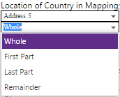 | Location | This field consists of four columns: • Whole Field – is used to indicate that the selected CyberStore address field should use the entire contents of the related SYSPRO field. • First Part - is used to indicate that the selected CyberStore address field should use only the first part of the contents of the related SYSPRO field, up to the entered Separator indicated in the next column. • Last Part - is used to indicate that the selected CyberStore address field should use only the last part of the contents of the related SYSPRO field, from the Separator indicated in the next column. • Remainder - is used to indicate that the selected CyberStore address field should use the remaining text that have not been indicated for another address field. |