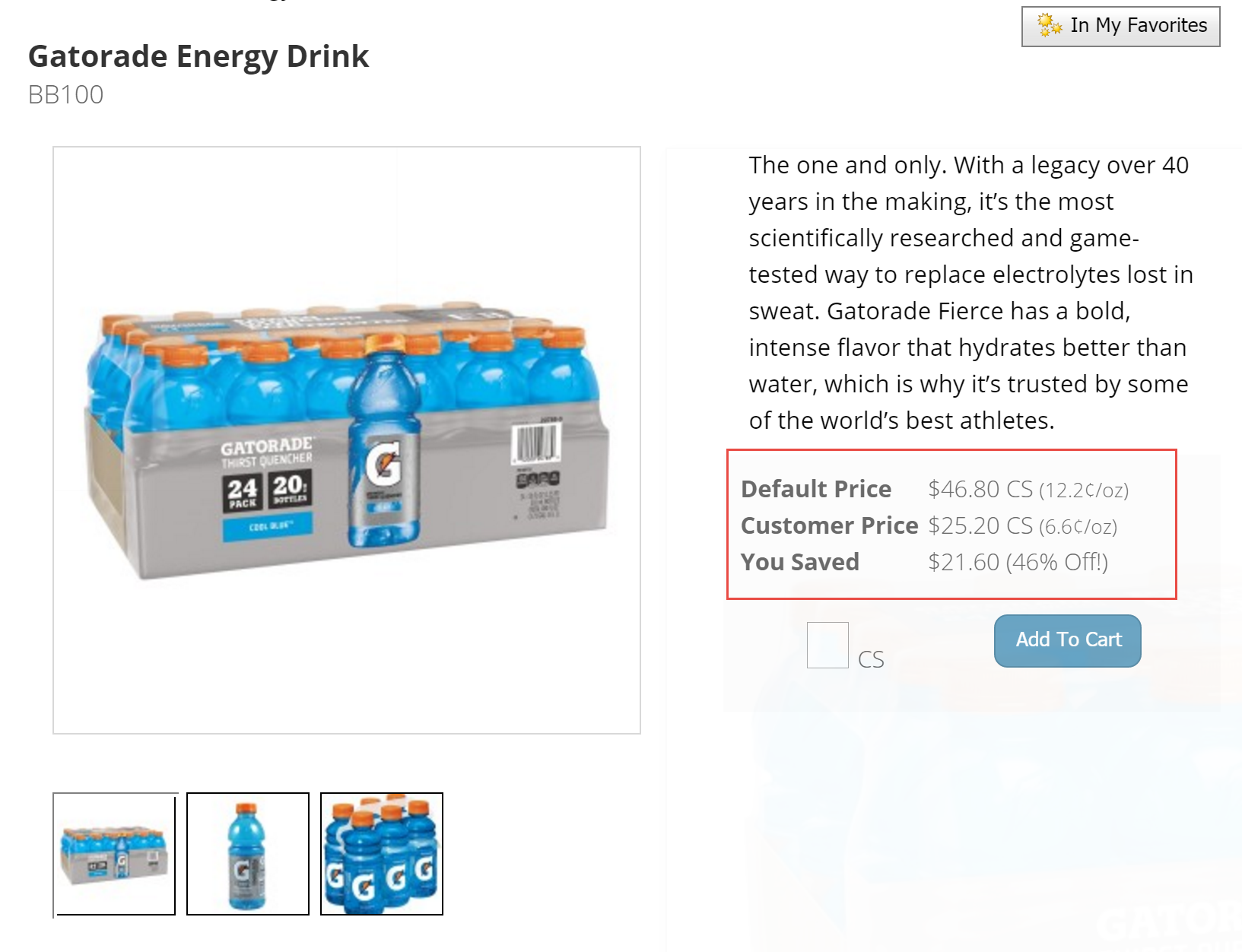 In contrast, when the Pricing Unit is the same as the Relative Unit, the price per unit is not displayed, even if set to "show."