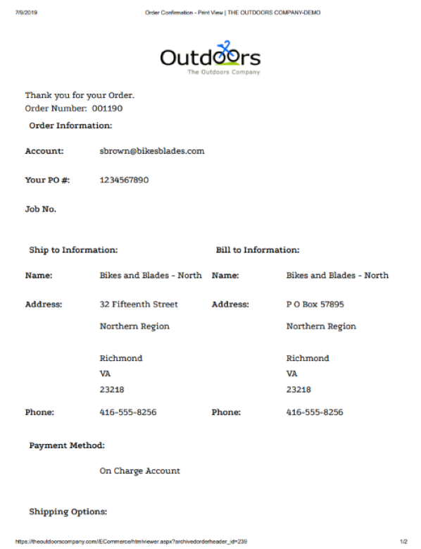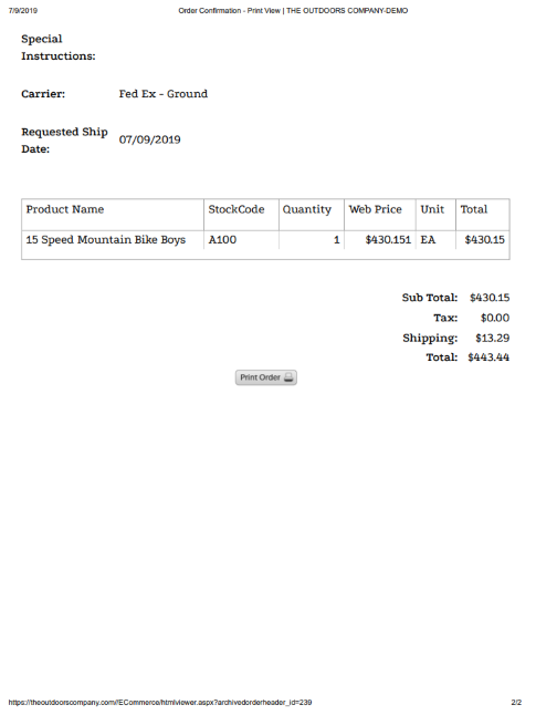 After the shopper completes their order, the CheckOutPrintOrderConfirmation control displays a printable view of the order that they can save for their records.