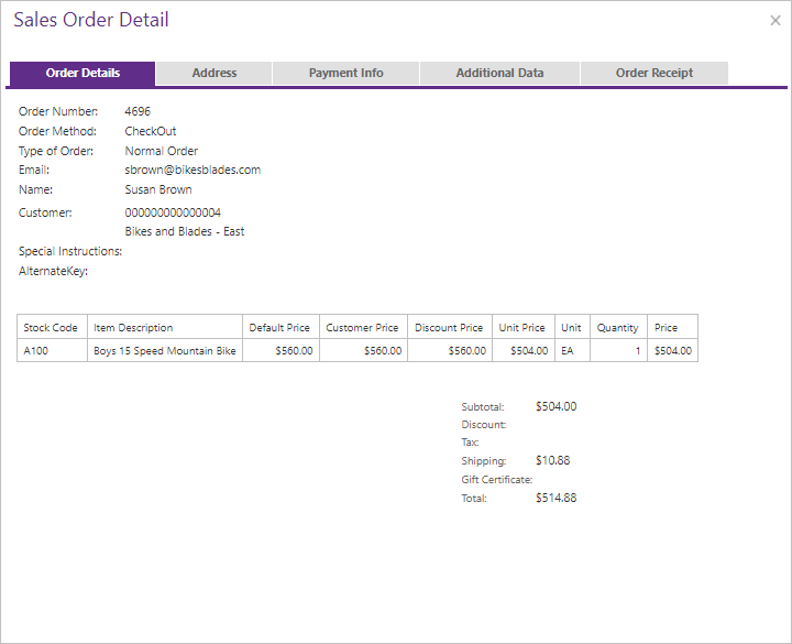 Use the Order Receipttab to displays a snapshot of the receipt information as it was displayed to the shopper at time of an order.
