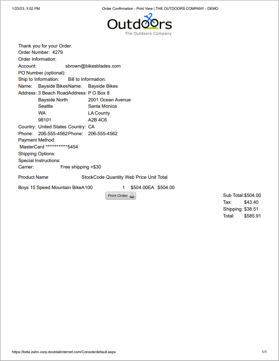 A button that, when clicked, allows you to print out the order receipt. This is a snapshot of what the order receipt looked like when presented to the customer after confirming the order. |
