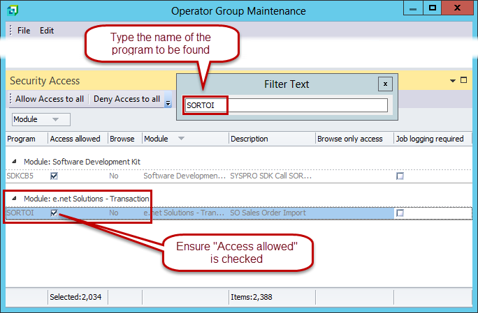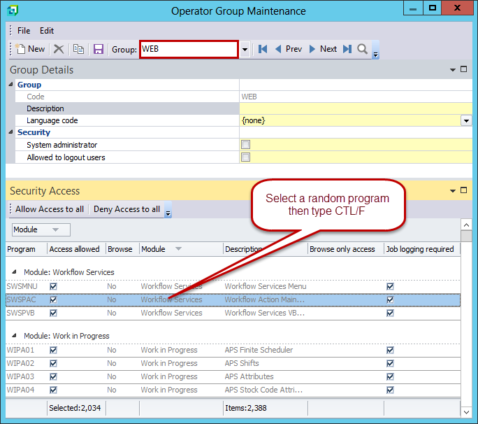 To configure these permissions, start at the SYSPRO main window. Go to Setup > Groups. Highlight the WEB Operator Group you have just created. Then click "Modify."