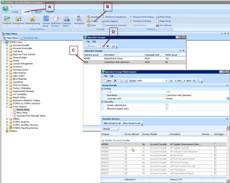 SYSThere must be one SYSPRO Operator Group and one SYSPRO Operator Account in SYSPRO, in addition to the Service Account (CyberStoreRemoting) previously discussed in Windows User Accounts. Because CyberStore uses e.net to read and write from/to SYSPRO data, it is important to configure the correct security in SYSPRO for this Operator and Group.