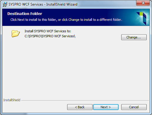 Once the "SYSPRO WCF Service: Destination Folder" window displays, indicate the folder to which you want to install the SYSPRO WCF Service.
