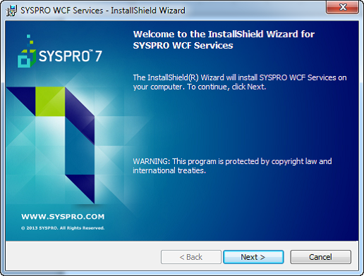 When the "SYSPRO WCF Services - InstallShield Wizard" window displays, simply select Next >.