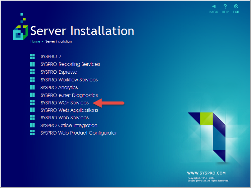 Once the "Server Installation" window displays, choose "SYSPRO WCF Services."