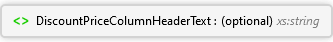 <xs:element minOccurs="0" maxOccurs="1" name="DiscountPriceColumnHeaderText" type="xs:string" xmlns:xs="http://www.w3.org/2001/XMLSchema" />
